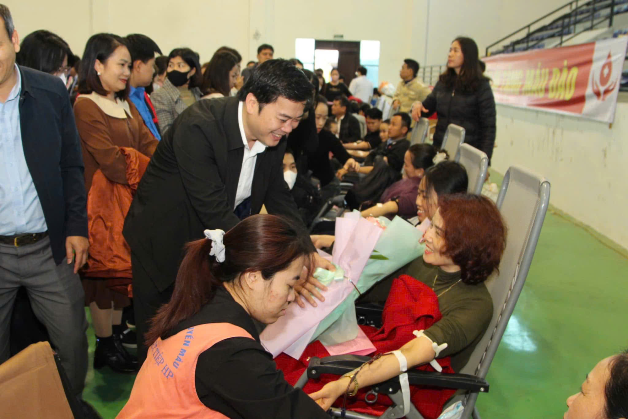 Đ/c Lê Hữu Toản - PBT Huyện uỷ tặng hoa động viên