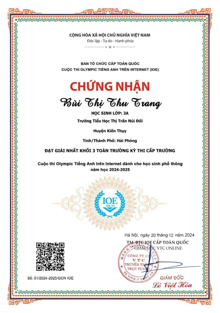 Vừa qua, các học sinh khối lớp 3, 4, 5 của trường Tiểu học Thị Trấn Núi Đối đã tham gia kỳ thi IOE (Olympic Tiếng Anh trên Internet) với tinh thần học hỏi, quyết tâm và nỗ lực hết mình. Đây là sân chơi trí tuệ giúp các em nâng cao kỹ năng tiếng Anh, rèn luyện tư duy, và khẳng định năng lực của bản thân. Chúc mừng các em học sinh đã xuất sắc vượt qua kỳ thi và đạt được những kết quả đáng tự hào! Dưới đây là danh sách và Giấy chứng nhận các bạn học sinh đạt giải:• Khối 3:
